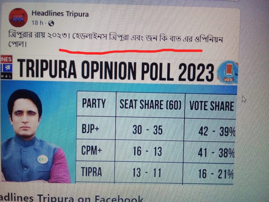 সম্প্রতি ভোট সমীক্ষক সংস্থা জান কি বাত ত্রিপুরার ২৩- র বিধানসভা নির্বাচন নিয়ে ওপিনিয়ন পোল করেছিলো। জান কি বাত ভোট সমীক্ষক সংস্থার ওপিনিয়ন পোলে দেখানো হয়েছিল , নির্বাচনে ৩০ থেকে ৩৫ টি আসন পেতে পারে বিজেপি – আইপিএফটি জোট। শতাংশের হিসাবে ভোট পাবে ৩৯ থেকে ৪২ শতাংশ।