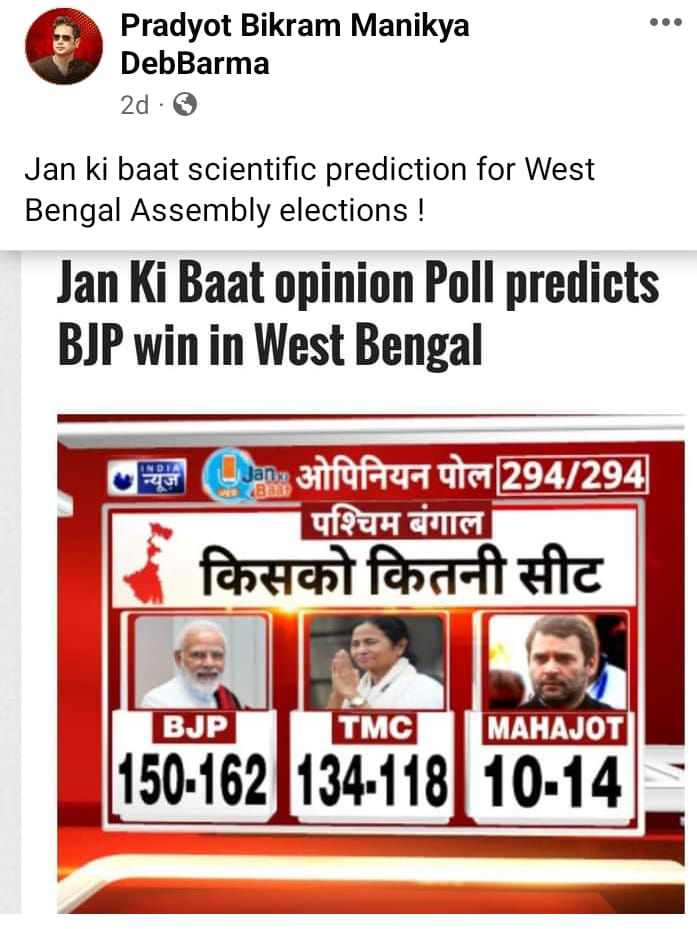 স্বাভাবিক কারণেই ২৩- র ত্রিপুরার বিধানসভা নির্বাচন নিয়ে জান কি বাতের সমীক্ষার উপর ভরসা রাখতে পারেননি প্রদ্যুৎ কিশোর।তাই তিনি উপহাস করে সামাজিক যোগাযোগ মাধ্যমে পশ্চিমবাংলার শেষ বিধানসভা নির্বাচনের জান কি বাত সমিক্ষক সংস্থার সমীক্ষা তুলে ধরে রীতিমতো উপহাস করেন। এবং এই সংস্থার সমীক্ষাকে সাইন্টিফিক প্রেডিকশন বলেও কটাক্ষ করেন প্রদ্যুৎ।