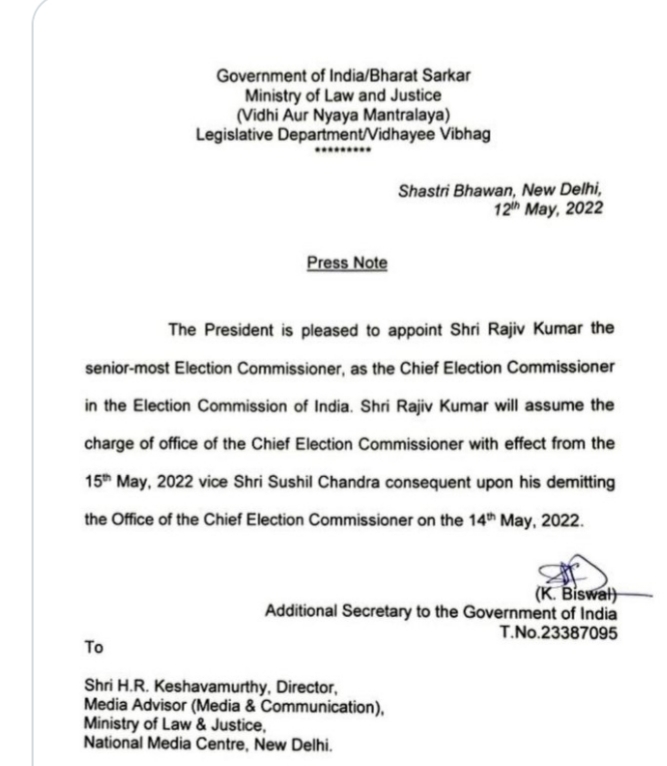 প্রসঙ্গত রাজীব কুমার ১৯৮৪সালের আইপিএস। তিনি বিহার -ঝাড়খন্ড সহ কেন্দ্রীয় সরকারের বিভিন্ন দপ্তরে সাফল্যের সঙ্গে কাজ করেছেন। কেন্দ্রীয় মন্ত্রী কিরেন রিজিজু টুইট করে রাজীব কুমারের মুখ্য নির্বাচন কমিশনার পদে পদোন্নতি পাওয়ার কথা জানিয়েছিলেন।