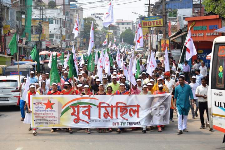 আসন্ন লোকসভা নির্বাচনের প্রাক লগ্নে শক্তির মহড়া দিলো সিপিআইএম। দলের যুব সংগঠনের ডাকে রাজধানীতে বিশাল মিছিল করে বামেরা। মূলত বেকারদের কাজের দাবি এবং যুব সমাজকে নেশার কড়াল গ্রাস থেকে মুক্তি দেওয়ার দাবি তুলে সরব হয় লাল বাড়ির যুবারা।অনুষ্ঠিত যুব সমাবেশে উপস্থিত ছিলেন প্রাক্তন মুখ্যমন্ত্রী ডা মানিক সরকার, সিপিআইএম রাজ্য সম্পাদক জিতেন্দ্র চৌধুরী, যুব নেতা নবারুণ দেব, অমলেন্দু দেববর্মা সহ অন্যান্যরা।