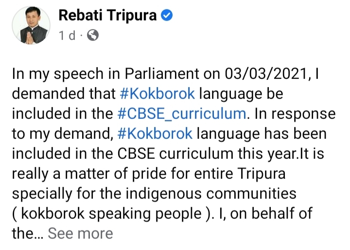 রাজ্যের ককবরক ভাষাকে সেন্ট্রাল বোর্ড অফ সেকেন্ডারি এডুকেশনে অন্তর্ভুক্ত করা হয়েছে। এটা অবশ্যই রাজ্যের জন্য গর্বের।এখন থেকে রাজ্যের ককবরক ভাষাভাষীর ছাত্র-ছাত্রীরা সিবিএসই’র সমস্ত পরীক্ষায় নিজেদের ভাষায় পরীক্ষা দিতে পারবে।২০২৩-র বিধানসভা ভোটের আগে জনজাতিদের নিয়ে প্রদ্যুত কিশোরের আন্দোলনকে অনেকটা ব্রেক গিয়ার দিতে পারবে কেন্দ্রীয় সরকারের এই সিদ্ধান্ত।