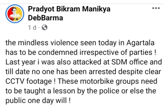 অন্যদিকে সুদীপ ইস্যুতে মুখ্যমন্ত্রী তাঁর রাজধর্ম পালন করেছেন। পুলিশ গ্রেফতার করেছে অভিযুক্তদের।এখন ঘটনার তদন্ত চলছে। পাহাড়ে কোনো ঘটনায় জড়িত তিপ্রা মথার লোকজনকে গ্রেফতার করতে গেলেই তারা পুলিশকেও পাল্টা আক্রমন করে। এই সংক্রান্ত অনেক ঘটনা রয়েছে।তারপরও প্রদ্যুত মুখ খোলেন নি।অথচ তিনি কোনো রাজনৈতিক দলের নাম করেই বাইক বাহিনীকে খুচিয়ে প্রকারন্তে বিজেপি’র দিকেই আক্রমণের ‘বর্শা’ ছুড়েছেন।