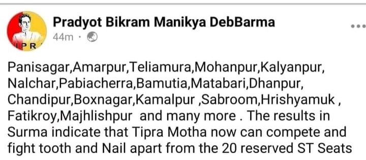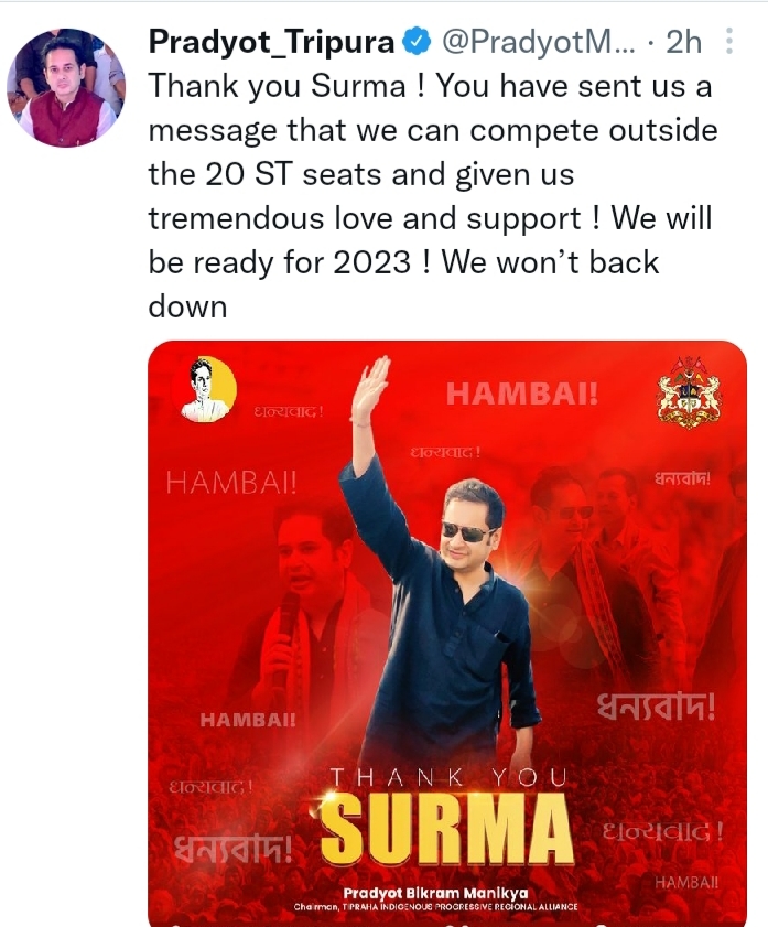 প্রদ্যুৎ কিশোর আগেই বার্তা দিয়েছিলেন, ২৩- র বিধানসভা নির্বাচনে ২০টি উপজাতি সংরক্ষিত আসন ছাড়াও অন্যান্য আসনে প্রার্থীদের দেবে তিপ্রামথা।বলা চলে,প্রদ্যুৎ কিশোর সুরমা কেন্দ্রে তারই মহড়া দিলেন। তফশিলী জাতি সংরক্ষিত সুরমা কেন্দ্রে বামেদের পেছনে ঠেলে দ্বিতীয় সারিতে উঠে আসে তিপ্রামাথা।৪হাজার ৫শ ৮৩ভোটের ব্যবধানে মথার প্রার্থী বাবুলাল সাতনামী পরাজিত হন বিজেপির প্রার্থী স্বপ্না দাস পালের কাছে। এটা বাস্তব, পাহাড়ের ২০টি সংরক্ষিত আসনের বাইরে তিপ্রামথা কি ধরনের সাড়া পাবে সুরমা কেন্দ্র দিয়ে তার স্পষ্ট ইঙ্গিত পেয়েছেন প্রদ্যুৎ কিশোর।