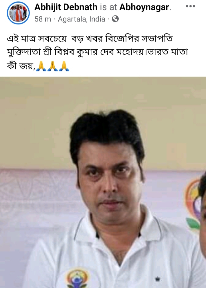 এই মুহূর্তে রাজ্যে অবস্থান করছেন বিজেপির সর্বভারতীয় সাংগঠনিক সাধারণ সম্পাদক বি এল সন্তোষ। তিনি বৈঠক করছেন প্রদেশ বিজেপির কার্যালয়ে। ঠিক এই সময়েই সামাজিক যোগাযোগ মাধ্যমে “ভাইরাল” বিপ্লব দেবই হচ্ছেন রাজ্য বিজেপির পরবর্তী সভাপতি।”জনতার মশাল” এই খবরের সত্যতা যাচাই করিনি। তবে সামাজিক যোগাযোগ মাধ্যমের পাওয়া তথ্য অনুযায়ী এখবর প্রকাশ করা হয়েছে।