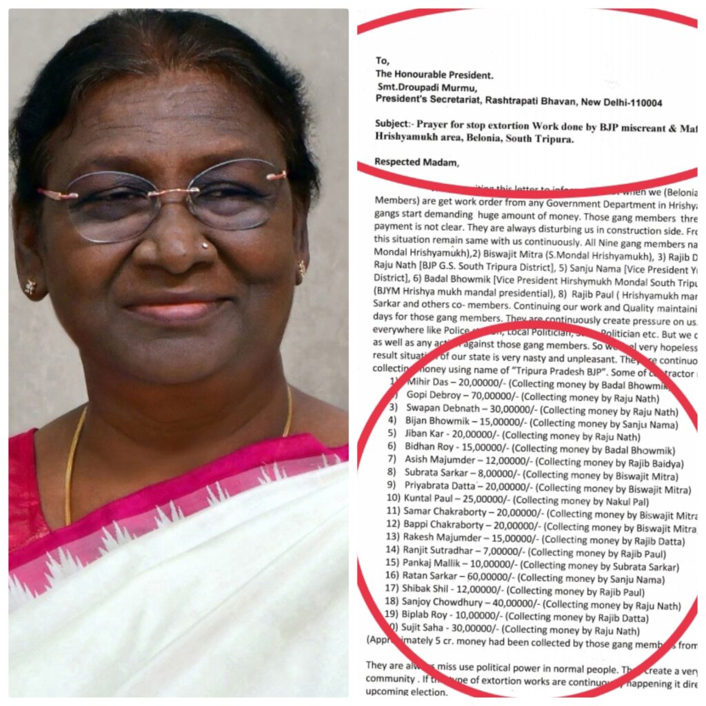 বিলোনিয়াতে শুরু ঠিকাদারদের দমন – পীড়ন।আগ্নেয়াস্ত্রের মুখে দেওয়া হচ্ছে হুমকী।রাষ্ট্রপতির কাছে তোলাবাজ নেতাদের সম্পর্কে দেওয়া চিঠির ইস্যুতে ঠিকাদারদের মুচলেকা দিতে চাপ।ঠিকাদারদের পাল্টা সাংবাদিক বৈঠক করার হুলিয়া জারি করেছে বিজেপির তোলাবাজ নেতারা।