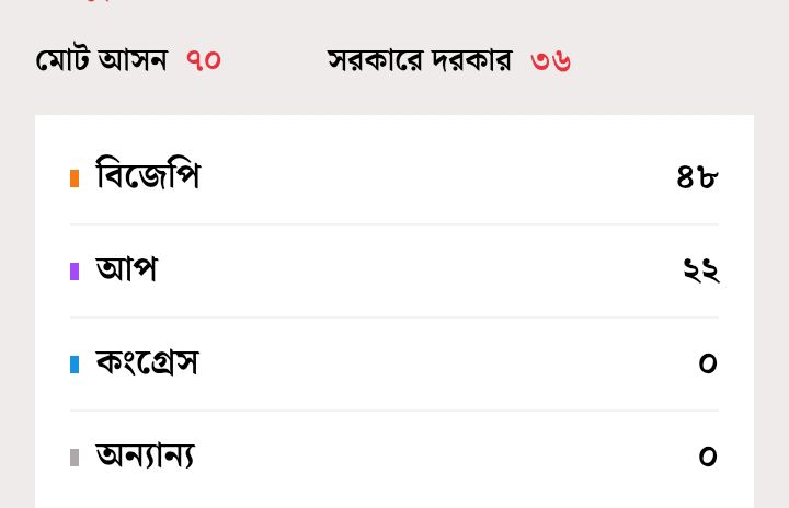 ভারতীয় নির্বাচন কমিশনের সর্বশেষ তথ্য অনুযায়ী, দিল্লি বিধানসভার ৭০ আসনের মধ্যে ৪৮টি আসন দখল করেছে ভারতীয় জনতা পার্টি।বাদবাকি ২২টি আসন গিয়েছে আপের ঝুলিতে।কংগ্রেসের কৌটা শূন্য। ক্ষমতা দখলের জাদু সংখ্যা ৩৬। তার বহু আগেই আটকে যায় অরবিন্দ কেজরিওয়ালের দল আপ আদমি পার্টি।