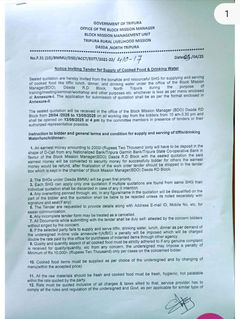 সম্প্রতি ত্রিপুরা গ্রামীণ জীবিকা মিশনের অন্তর্গত দাশদা ব্লকে খাদ্য সরবরাহের টেন্ডার বের হয়। এই টেন্ডার প্রক্রিয়ায় অংশ গ্রহণ করে মোট ছয় জন মহিলা। কিন্তু অবাক করার মতো ঘটনা টেন্ডার বক্স খোলে অন্যান্য প্রতিযোগীদের টেন্ডারের রেট ফাঁস করে দেন ব্লকের হিসাব রক্ষক বীরজিৎ দাস।