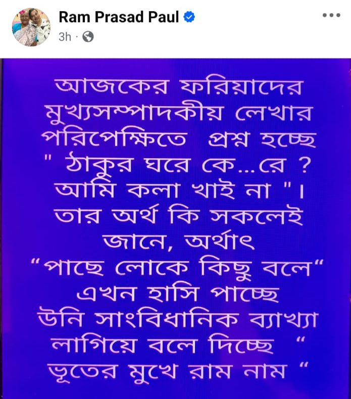 জনমনে প্রশ্ন উঠছে, তাহলে কী সামাজিক যোগাযোগ মাধ্যমে পত্রিকা বিক্রেতার বিরুদ্ধে উপাধ্যক্ষের তোলা অভিযোগ মিথ্যা? এই মিথ্যাচার কি শুধুই ব্যক্তিগত বিদ্বেষের নোংরা স্ক্রিপ্টের “ভূমিকা”? যদি তাই হয়ে থাকে, উপাধ্যক্ষ সাহেব নিজেই পুনরায় নিজের ভেরিফাইড ফেসবুক পেজে তার”উপসংহার’ও” টেনে দিয়েছেন আজকের সকালে। উপাধ্যক্ষ পাল্টা লিখেছেন, ” আজকের ফরিয়াদের মুখ্য সম্পাদকীয় লেখার প্রেক্ষিতে প্রশ্ন হচ্ছে ঠাকুর ঘরে কে…রে? আমি কলা খাই না। তার অর্থ কি সকলেই জানে, অর্থাৎ “পাছে লোকে কিছু বলে” এখন হাসি পাচ্ছে, উনি সাংবিধানিক ব্যাখ্যা লাগিয়ে বলে দিয়েছেন ভূতের মুখে রাম নাম’।” (উপাধ্যক্ষের ফেসবুক পোস্ট হুবহু তুলে ধরা হয়েছে তাঁর পেজ থেকে)। উপাধ্যক্ষের এই পোস্টেও কিছু কিছু ক্ষেত্রে আছে শব্দের “অপভ্রংশ”। বলছেন বাংলা নিয়ে চর্চা করা বিশেষজ্ঞরা।