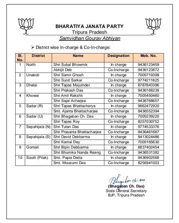 ডেস্ক রিপোর্টার, ৩ফেব্রুয়ারি।। রাজ্যের প্রধান বিরোধী দল সিপিআইএম রাজ্য কমিটির প্রকাশ্য সমাবেশে শক্তি প্রদর্শন করেছে। তাহলে, শাসক দল ভারতীর জনতা পার্টি কি বসে থাকবে। না, ভাজ্পা তাদের শক্তি প্রদর্শনের জন্য বেছে নিয়েছে “সংবিধান গৌরব অভিযান”কে। এই অভিযানকে সামনে রেখে চলতি মাসেই শহরের স্বামী বিবেকানন্দ ময়দানে শক্তির মহড়া দেবে প্রদেশ বিজেপি। তার রূপ রেখা প্রায় প্রস্তুত। ইতিমধ্যেই বুথ ও মন্ডল স্তরে সংবিধান গৌরব অভিযান প্রায় শেষ। জেলা স্তরে সংবিধান গৌরব অভিযানকে সফল ভাবে পূর্ণাঙ্গ রূপ দিতে নতুন কমিটি গঠন করেছে ভাজপা। প্রতিটি জেলার জন্য পৃথক পৃথকভাবে ইনচার্জ ও কো-ইনচার্জ’ র দায়িত্ব বর্তে দেওয়া হয়েছে নেতৃত্বকে।প্রদেশ বিজেপির সাধারন সম্পাদক ভগবান দাসের স্বাক্ষরিত তালিকায় মোট ২০ জন নেতার নাম রয়েছে।তারা ১০ জেলাতে সংবিধান গৌরব অভিযানকে সফল করার জন্য তারা কাজ করবেন।