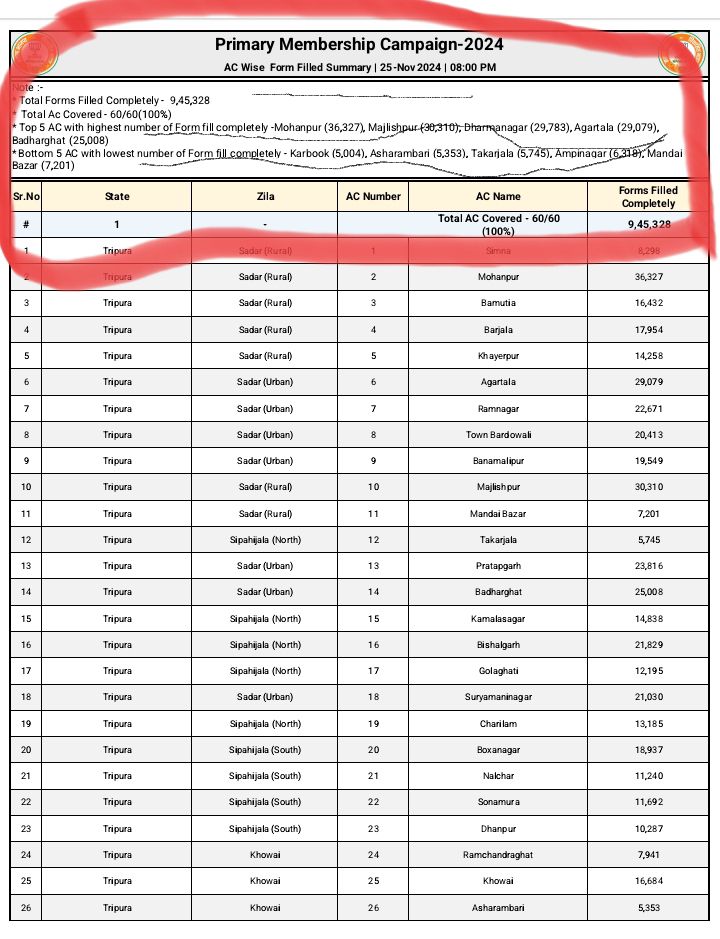 এডিসির বাইরের পাঁচটি বিধানসভা আসনে সর্বাধিক মানুষ বিজেপির সদস্যতা পদ গ্রহণ করেছেন। তারমধ্যে রয়েছে মন্ত্রী রতন লাল নাথের মোহনপুর। মন্ত্রী সুশান্ত চৌধুরীর মজলিশপুর।রাজ্য বিধানসভার অধ্যক্ষ বিশ্ববন্ধু সেনের ধর্মনগর।আগরতলা কেন্দ্র ও বিধায়িকা মিনা সরকারের বাধারঘাট।