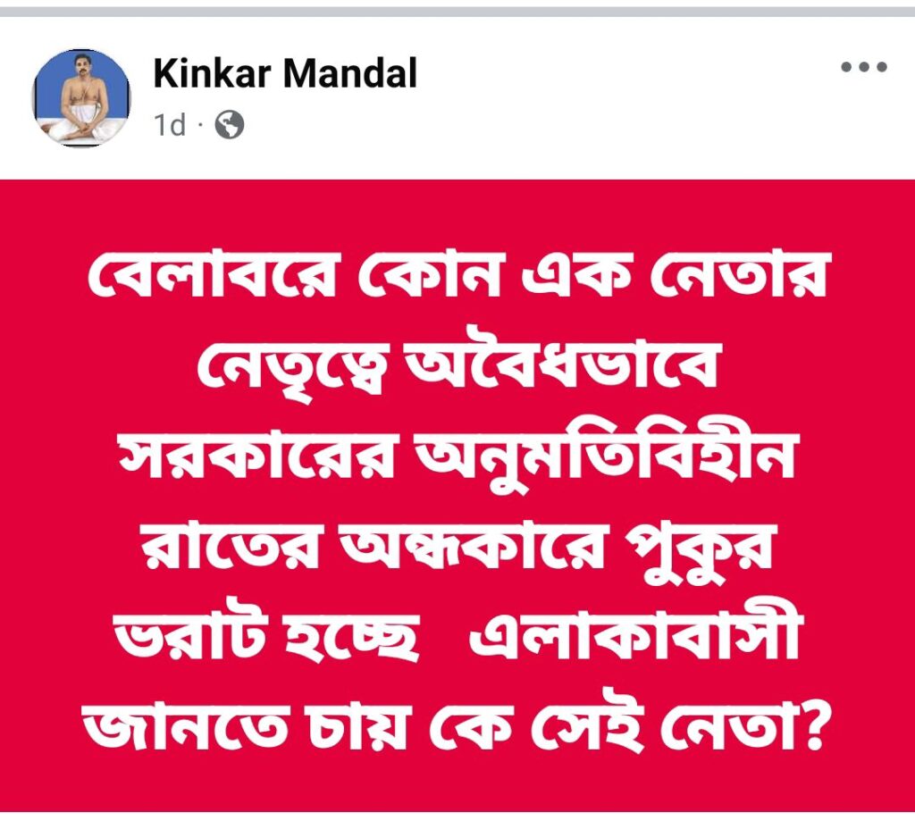 কিঙ্কর তার সামাজিক যোগাযোগ মাধ্যমে একটি পোস্ট করে বলেন, ” এলাকার কোন এক নেতার মদতে রাতের অন্ধকারে সরকার অনুমতিবিহীন পুকুর ভরাট করা হচ্ছে। মানুষ জানতে চায় এই নেতার নাম।” অর্থাৎ জমি দস্যু দুই পঞ্চায়েত সদস্যের পেছনে রয়েছেন আরো এক নেতা।যিনি তাদের উপদেষ্টা। তিনি কে? কিঙ্কর মন্ডলের পোস্ট থেকে পরিষ্কার স্থানীয় বিজেপির নেতাদের যোগসাজশেই বেআইনি ভাবেই চলছে পুকুর ভরাট।
