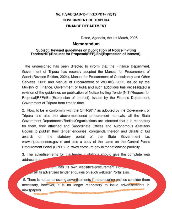 রাজ্যে সরকারের অর্থ দপ্তরের জারি করা নির্দেশাবলীতে বলা হয়েছে, ‘ বিভিন্ন দপ্তরের টেন্ডার সংক্রান্ত বিজ্ঞাপন সংবাদ পত্র সহ বিভিন্ন সংবাদ মাধ্যমে দেওয়া বাধ্যতামূলক নয়।’ তবে বিজ্ঞাপনকারী প্রতিষ্ঠান ইচ্ছা করলে বিজ্ঞাপন জারি করতে পারে।তাতে কোনো বাধা নেই।”