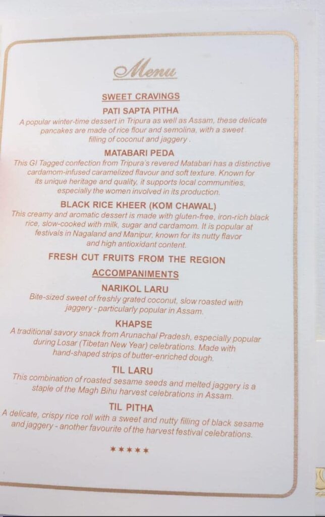 মুখ্যমন্ত্রী তাঁর ফেসবুক পেজে রাষ্ট্রপতি ভবনের চা চক্রের একটি ম্যানু পোস্ট করেন। এই ম্যানুতে প্রথমেই আছে পাটি সাপটা পিঠা। সঙ্গে আছে এই পিঠার বিবরণ। ম্যানুতে বলা হয়েছে, ত্রিপুরা এবং আসামের একটি জনপ্রিয় শীতকালীন মিষ্টি।এই নরম পিঠাগুলো চালের গুঁড়ো ও সুজি দিয়ে তৈরি হয় এবং এর ভেতরে নারকেল ও গুড়ের মিষ্টি পুর থাকে। ম্যানুর তালিকার দ্বিতীয় স্থানে আছে মাতাবাড়ির পেঁড়া।তাতে লেখা আছে, ত্রিপুরার মাতাবাড়ির এই মিষ্টিটি একটি স্বতন্ত্র এলাচ-মিশ্রিত ক্যারামেলাইজড স্বাদ। এর অনন্য ঐতিহ্য এবং উন্নত মানের জন্য পরিচিত।