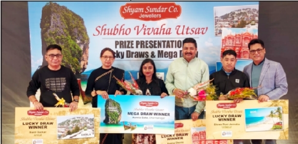 রাজধানীর মানিক্য এনক্লেভে শ্যাম সুন্দর কোং জুয়েলার্স “শুভবিবাহ উৎসব” লাকি ড্র এবং মেগা লাকি ড্র পুরস্কার বিতরণ অনুষ্ঠান অনুষ্ঠিত হয় রবিবার। শ্যাম সুন্দর কোং জুয়েলার্সের শুভ বিবাহ উৎসব ১৮ই নভেম্বর ২০২৫ থেকে ৩১শে ডিসেম্বর ২০২৫ পর্যন্ত বহু অফার ও আকর্ষণের সঙ্গে সফলভাবে অনুষ্ঠিত হয়েছিল – যার মধ্যে ছিল সিমলা, জয়পুর এবং গোয়ায় ৩টি হানিমুন প্যাকেজের লাকি ড্র এবং থাইল্যান্ডের ফুকেতে হানিমুন প্যাকেজের ১টি মেগা ড্র। এই মাসের শুরুতে লাকি ড্রয়ের মাধ্যমে কুপনগুলি বেছে নেওয়া হয়েছিল। উওর জেলার জেলা শাসক চাঁদনি চন্দ্রন, উত্তর ত্রিপুরা-মেগা লাকি ড্র অনুষ্ঠানের প্রধান অতিথি হিসাবে উপস্থিত ছিলেন। লাকি ড্র বিজয়ীরা হলেন-সুনীল সরকার, আমতলী (কুপন এ ১৭২৭), ঝর্না সোম, কল্যাণপুর (কুপন এ ১৫০১), বিশ্বরাণী জামাতিয়া, উদয়পুর (কুপন ডি ১০২৪), যারা যথাক্রমে সিমলা, জয়পুর ও গোয়া-তে “৩ রাত, ৪ দিনের হানিমুন প্যাকেজ” জিতেছেন। এবং মেগা ড্র-এর বিজয়ী অস্মিতা সাহা, ধর্মনগর (কুপন এ ১২৮৮) থাইল্যান্ডের ফুকেতে “৩ রাত, ৪ দিন হানিমুন প্যাকেজ” জিতেছেন। এদিন “পুরস্কার বিতরণী” অনুষ্ঠানে চারজন ভাগ্যশালী বিজয়ীদের তাদের পুরস্কৃত প্যাকেজগুলি তুলে দেওয়া হয়। কুপনগুলি পেয়ে সৌভাগ্যবান গ্রাহকদের মুখে আনন্দ ও উচ্ছাস ফুটে উঠে। শ্যাম সুন্দরের এদিনের অনুষ্ঠানটি আনন্দ এবং উদযাপনের পরিবেশে ঘেরা ছিল।
