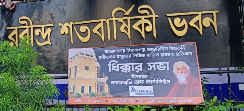 গত ১০ জুন বাংলাদেশের সিরাজগঞ্জে কাছারিবাড়িস্থিত রবীন্দ্র নাথের পৈত্রিক বাড়িতে হামলা করেছিলো দুষ্কৃতীরা। এই ঘটনার প্রতিবাদে দুই বাংলার মতো জ্বলে উঠে মেঘনা পাড়ের মুক্তি যুদ্ধের তীর্থভূমি ত্রিপুরার। রাজ্যের রাজ্যের বৃহত্তর সাংবাদিক সংগঠন অ্যাসেম্বলি অফ  জার্নালিস্ট’সও ইউনূসের দেশে রবীন্দ্র নাথের এই অপমান মেনে নিতে পারেনি। রাজ্যের একমাত্র সাংবাদিক সংগঠন হিসেবে অ্যাসেম্বলি অফ  জার্নালিস্ট’স এই ঘটনার তীব্র প্রতিবাদ করেছে।অবশ্যই অন্যান্য ভ্রাতৃপ্রতিম সাংবাদিক সংগঠন এওজে’ র এই আন্দোলনকে সমর্থন জানিয়েছে।