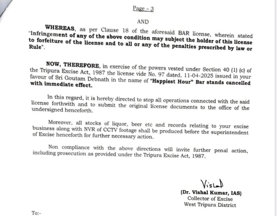 আগরতলার ইউডি ভবনের ছাদে অবস্থিত ‘হ্যাপিয়েস্ট আওয়ার’ রেস্তোরাঁ কাম বারের লাইসেন্স বাতিল করল পশ্চিম ত্রিপুরা জেলা প্রশাসন। মঙ্গলবার পশ্চিম ত্রিপুরা জেলার আবগারি কালেক্টর ড. বিশাল কুমার (আইএএস) এক আদেশে জানান, লাইসেন্সধারী গৌতম দেবনাথ একাধিকবার আবগারি আইনের শর্ত ভঙ্গ করেছেন।