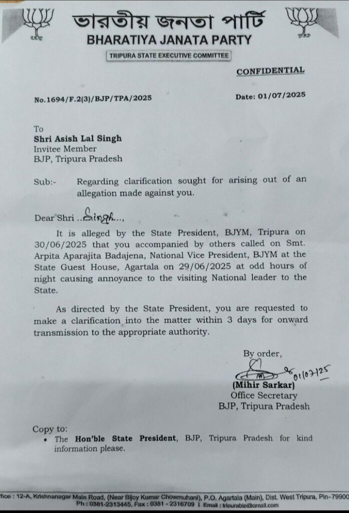 হঠাৎ করে ভারতীয় জনতা পার্টির সঙ্গে আশীষ লাল সিংয়ের দূরত্ব কেন? ঘটনার সূত্রপাত গত ২৯ জুন।এদিন রাতে রাজ্য অতিথি শালায় এসেছিলেন বিজেপির সর্ব ভারতীয় যুবমোর্চার সহ – সভাপতি অর্পিতা অপরাজিতা। রাতে অতিথি শালায় নেত্রীর সঙ্গে সাক্ষাৎ করতে গিয়েছিলেন আশীষ লাল সিং।সঙ্গে বিজেপির আরো কয়েকজন।নেত্রীর অভিযোগ, সাক্ষাতের সময় আশীষ লাল সহ অন্যান্যরা স্বাভাবিক ছিলেন না। দলের সর্ব ভারতীয় যুব ব্রিগেডের নেত্রী অর্পিতা অপরাজিতা এই সংক্রান্ত বিষয়ে রাজ্য নেতৃত্বকে অবগত করেন।