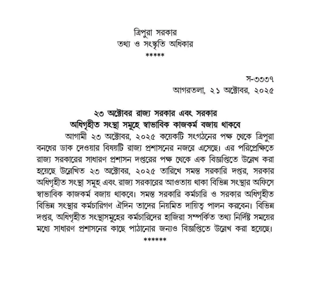 প্রাক্তন বৈরী নেতা তথা তিপ্রামথার বিধায়ক রঞ্জিতদেববর্মা নেতৃত্বাধীন তিপ্রা সিভিল সোসাইটির ডাকা বনধকে মান্যতা দিচ্ছে না রাজ্য সরকার। ত্রিপুরা তথ্য দপ্তর এক প্রেস বিজ্ঞপ্তিতে জানিয়ে দিয়েছে আগামী ২৩ অক্টোবর তিপ্রা সিভিল সোসাইটির ডাকা বনধ পালিত হবে না রাজ্যে।এদিন রাজ্যের সমস্ত সরকারি – বেসরকারি প্রতিষ্ঠান খোলা থাকবে। কাজ কর্ম থাকবে স্বাভাবিক। এদিন সমস্ত সরকারি, সরকার অধিগৃহীত বিভিন্ন সংস্থার কর্মচারীরা এদিন নিয়মিত দায়িত্ব পালন করবেন। যান চলাচল থাকবে স্বাভাবিক।