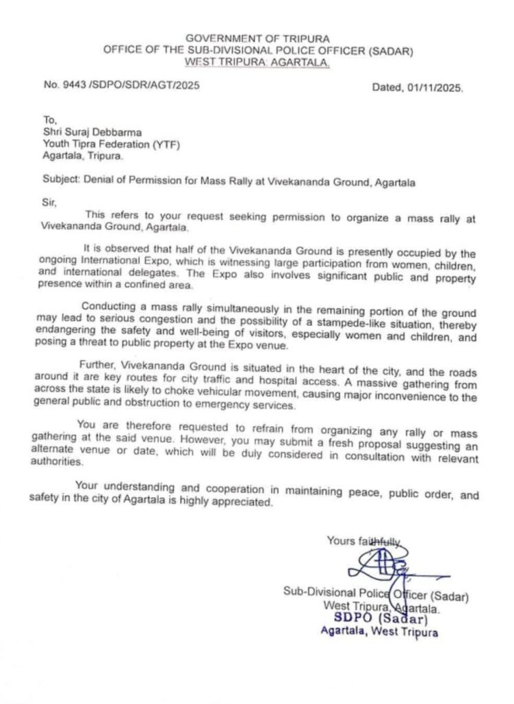 অবশেষে প্রদ্যুৎ কিশোরের মাথায় হাত। রাজ্য প্রশাসন বাতিল করে দিয়েছে প্রদ্যুৎ কিশোরের যুব ব্রিগেড ইউথ তিপ্রা ফেডারেশনের মিছিল ও জনসভা। সদর প্রশাসনের পক্ষ থেকে এই সংক্রান্ত চিঠি দিয়ে প্রদ্যুৎ কিশোরের যুব সংগঠনকে স্পষ্ট ভাবে জানিয়ে দেওয়া হয়েছে।