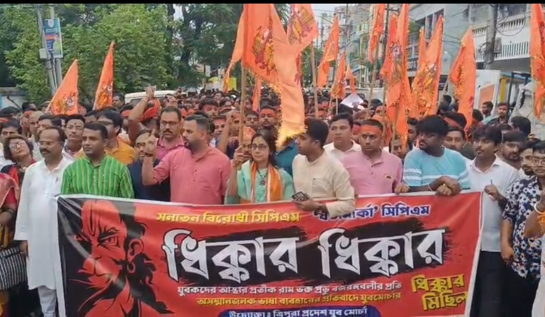 বিশালগড়ের বিধায়ক সুশান্ত দেব স্পষ্ট ভাবেই বলেছেন, হিন্দু ধর্মের উপর আঘাত লাগলে বিজেপি বসে থাকবে না। ঝাঁপিয়ে পড়বে। মঙ্গলবার বিকালে বৃষ্টিস্নাত রাজধানীতে যুবমোর্চার এই আন্দোলন শুধুমাত্র একটা ট্রেইলার (Trailer)। আগামী দিনে আরও কিছু দেখা যাবে।