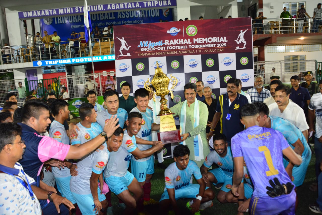সুদীর্ঘ ৬ বছর পর। রাখাল শিল্ড নক আউট ট্রফি ঘরে তুললো ফরোয়ার্ড ক্লাব। মঙ্গলবার আসরের মেগা ফাইনাল ম্যাচে ফরোয়ার্ড ক্লাব ২-০ গোলে পরাজিত করে কমলা কালো দল ব্লাড মাউথ ক্লাব কে। উমাকান্ত মিনি স্টেডিয়ামে এদিন সন্ধ্যায় ফ্লাড লাইটের অনুষ্ঠিত হয় ম্যাচটি। পরাজিত হলেও ব্লাড মাউথ ক্লাবের ফুটবলাররা দুরন্ত লড়াই ছুঁড়ে দিয়েছিলেন। কিন্তু ফরোয়ার্ড ক্লাবের রক্ষণভাগে চিড় ধরাতে ব্যর্থ হয়েছেন। এখানেই পিছিয়ে পড়ে কর্ণেন্দু দেববর্মার ছেলেরা। কয়েক হাজার ফুটবল প্রেমীদের উপস্থিতিতে এদিন ম্যাচের শুরু থেকে দুই দলের ফুটবলাররা আক্রমাত্মক ফুটবল খেলার চেষ্টা করেন। ম্যাচ শুরুর ১৭ মিনিটের মাথায় সেনথামিলস দুরন্ত গোল করে এগিয়ে দেন ফরোয়ার্ড ক্লাবকে। ম্যাচে ফেরার জন্য ব্লাড মাউথ ক্লাবের ফুটবলারর আমাগো তো আক্রমণ করার চেষ্টা করলেও বিপক্ষের রক্ষণভাগে গিয়ে তেমন দানা বাঁধতে পারেননি। দ্বিতীয়ার্ধে ম্যাচে ফেরার জন্য মরিয়া হয়ে উঠেন ব্লাড মাউথ ক্লাবের ফুটবলাররা। আক্রমণ প্রতি আক্রমণে জমে উঠে ম্যাচ। দুজনের ফুটবোনা রায় গোল পায় একই খেলার চেষ্টা করতে থাকেন। তবে উইং গুলিকে তেমনভাবে ব্যবহার করতে লক্ষ্য করা যায়নি। ৫৬ মিনিটে সিয়াম পুঁইয় দুরন্ত গোল করে ফরোয়ার্ড ক্লাবের জয় নিশ্চিত করে দেন। দুগোল হজম করার পরও ম্যাচে ফেরার জন্য আপ্রাণ চেষ্টা করতে থাকেন কর্নেন্দু দেববর্মার ছেলেটা। ম্যাচের শেষ মিনিট পর্যন্ত ছিল উত্তেজনা। কিন্তু ব্লাড মাউথের যাবতীয় আক্রমণ  বিপক্ষের বক্সে গিয়ে আটকে যায়। শেষ পর্যন্ত ২-০ গোলে জয়লাভ করে রাখাল শিল্ড নক আউট ফুটবল ট্রফি ঘরে তুলল রোজের ফরোয়ার্ড ক্লাব। ২০১৯ সালে শেষ বার শিল্ড ট্রফি জয় করেছিল ফরোয়ার্ড ক্লাব। খেলা পরিচালনা করেন ধনেশ শাহ। খেলার শেষে মাঠেই হয় পুরস্কার বিতরণী অনুষ্ঠান। আসরের চ্যাম্পিয়ন এবং রানার্স দলকে প্রাইজমানি বাবদ ৬০ এবং ৪০ হাজার টাকা দেওয়া হয়।