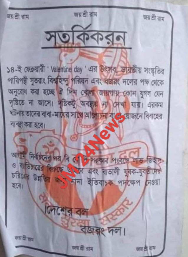 ডেস্ক রিপোর্টার,১৪ ফেব্রুয়ারি।। আজ ১৪ ফেব্রুয়ারি ‘ভ্যালেন্টাইন ডে’। এই দিনে হুলিয়া জারি করেছে রাষ্টবাদী সংগঠন বিশ্ব হিন্দু পরিষদ ও বজরং দল! এই দুই সংগঠনের নাম দিয়ে একটি লিফলেট বিলি করা হয়েছে পশ্চিম বাংলার বিভিন্ন প্রান্তে । বিশ্ব হিন্দু পরিষদ ও বজরং দলের বিলি করা লিফলেট এ দাবি করা হয়েছে, “ভ্যালেন্টাইন ডে” ভারতীয় সংস্কৃতির পরিপন্থী।এদিনই কোনো প্রেমিক যুগল যেন খোলা জায়গাতে এক সঙ্গে ঘোরাঘুরি না করে।তাদেরকে দৃষ্টি কটুর অবস্থায় পাওয়া গেলে ধরে বিয়ে করিয়ে দেওয়া হবে।